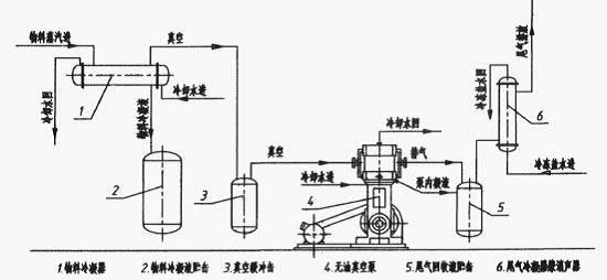 下圖是實(shí)際生產(chǎn)中應(yīng)用的一個(gè)物料減壓回收流程示意圖。圖中,物料蒸汽在主冷凝器中被基本冷凝成液體,但在真空條件下,氣體分子運(yùn)動(dòng)速度加快,氣體密度減小,物料的凝結(jié)溫度下降,冷凝器的總傳熱系數(shù)成倍縮小,因而在真空下物料冷凝(一次冷凝)往往不是很充分,尤其是低沸點(diǎn)溶劑類。未被充分冷凝的氣體一部份在真空泵內(nèi)隨著壓力的變化而液化,另一部份則在排氣側(cè)冷凝器中常壓下冷凝(二次冷凝)。 |
